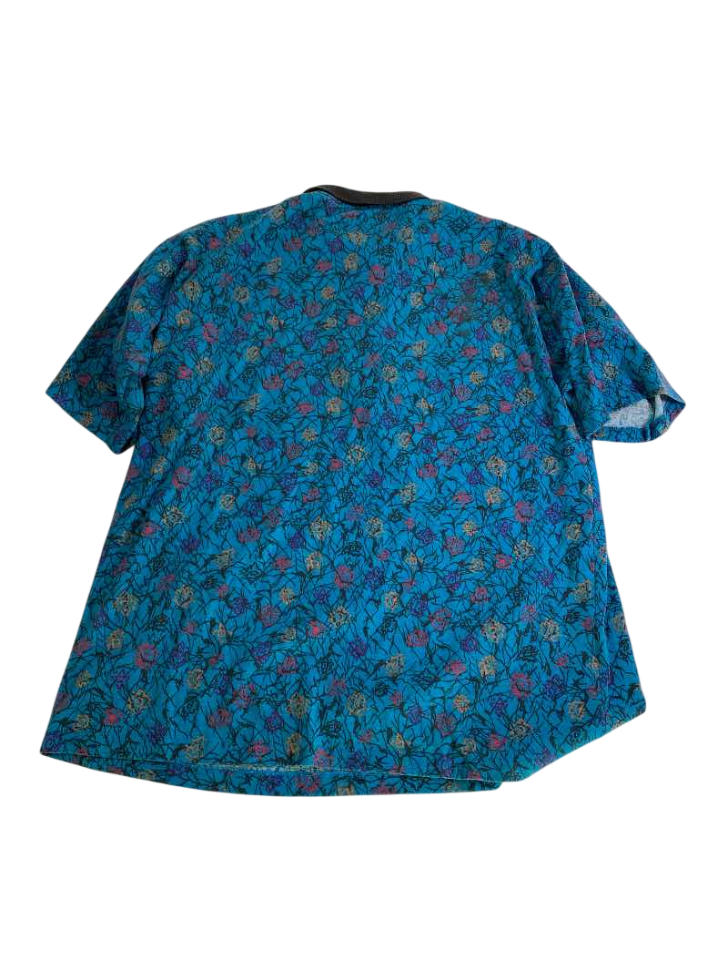Blue with multicolor floral print vintage polo shirt in Good condition. Features a unique artistic floral pattern and a contrasting black collar, showcasing a retro-inspired design. Perfect for adding a bold, artistic touch to casual outfits.